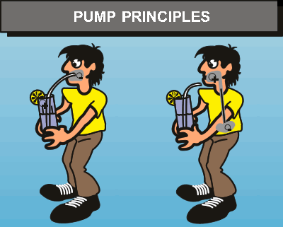 All pumps use basic forces of nature to move a liquid. As the moving pump part (impeller, vane, piston diaphragm,etc.) begins to move, air is pushed out of the way. The movement of air creates a partial vacuum (low pressure) which can be filled up by more air, or in the case of water pumps, water. This is similar to sucking on a straw. A partial vacuum is created in your mouth when you suck on the straw. The liquid is pushed up the straw because of the pressure differences between your mouth and the atmosphere.